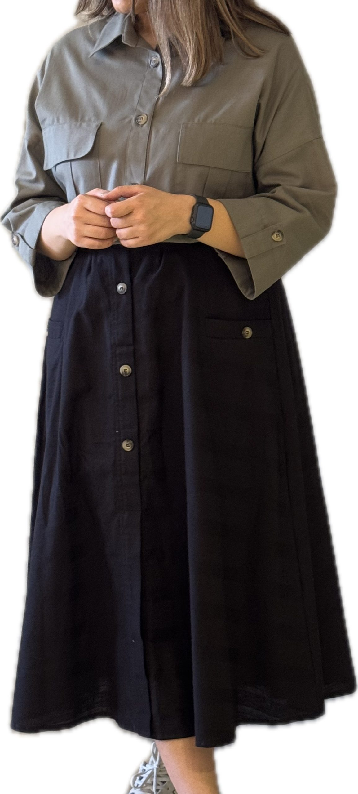 دامن نیم کلوش اسپرت جلو دکمه دار یک مدل شیک و مدرن از دامن کلوش است که از سیلوئت معروف دهه ۱۹۲۰ الهام گرفته شده است.
